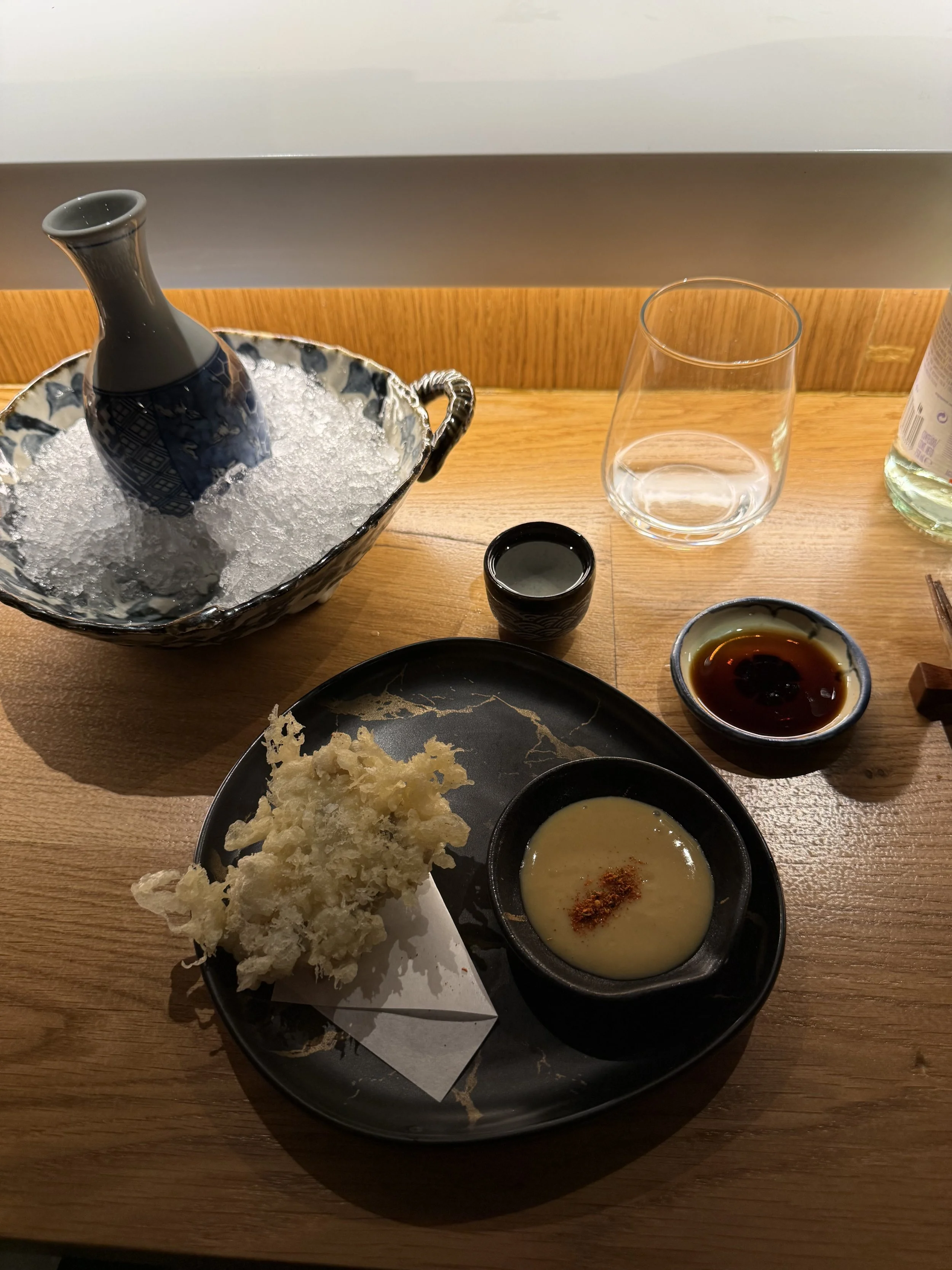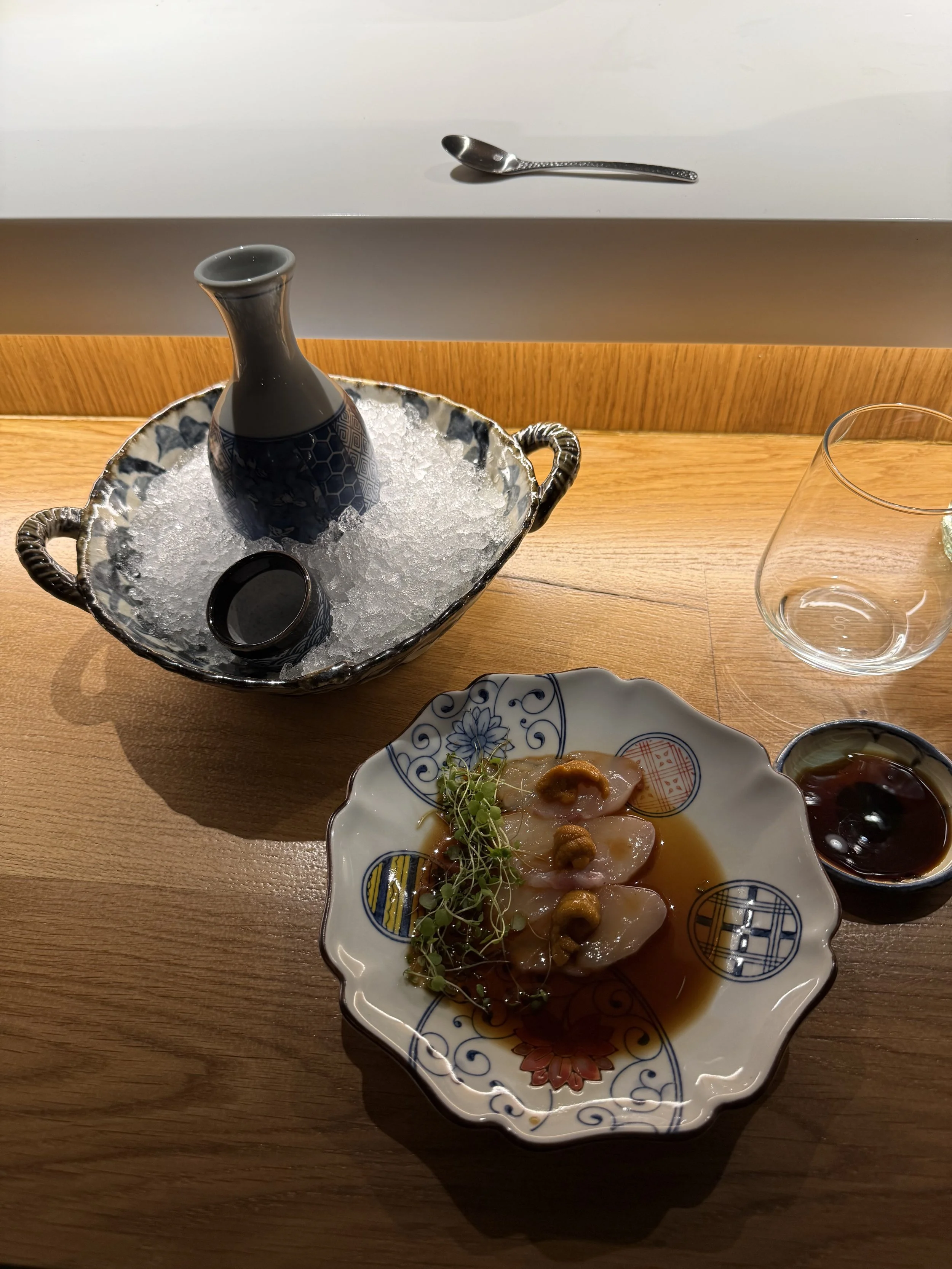 I took my seat at the counter, and immediately understood why this is the preferred way to experience omakase. Sitting here isn't passive observation….it's participation in a culinary performance, a front-row seat to craftsmanship that has been refined over years of training. The proximity to the chef creates an intimacy that transforms the meal from transaction to relationship.
