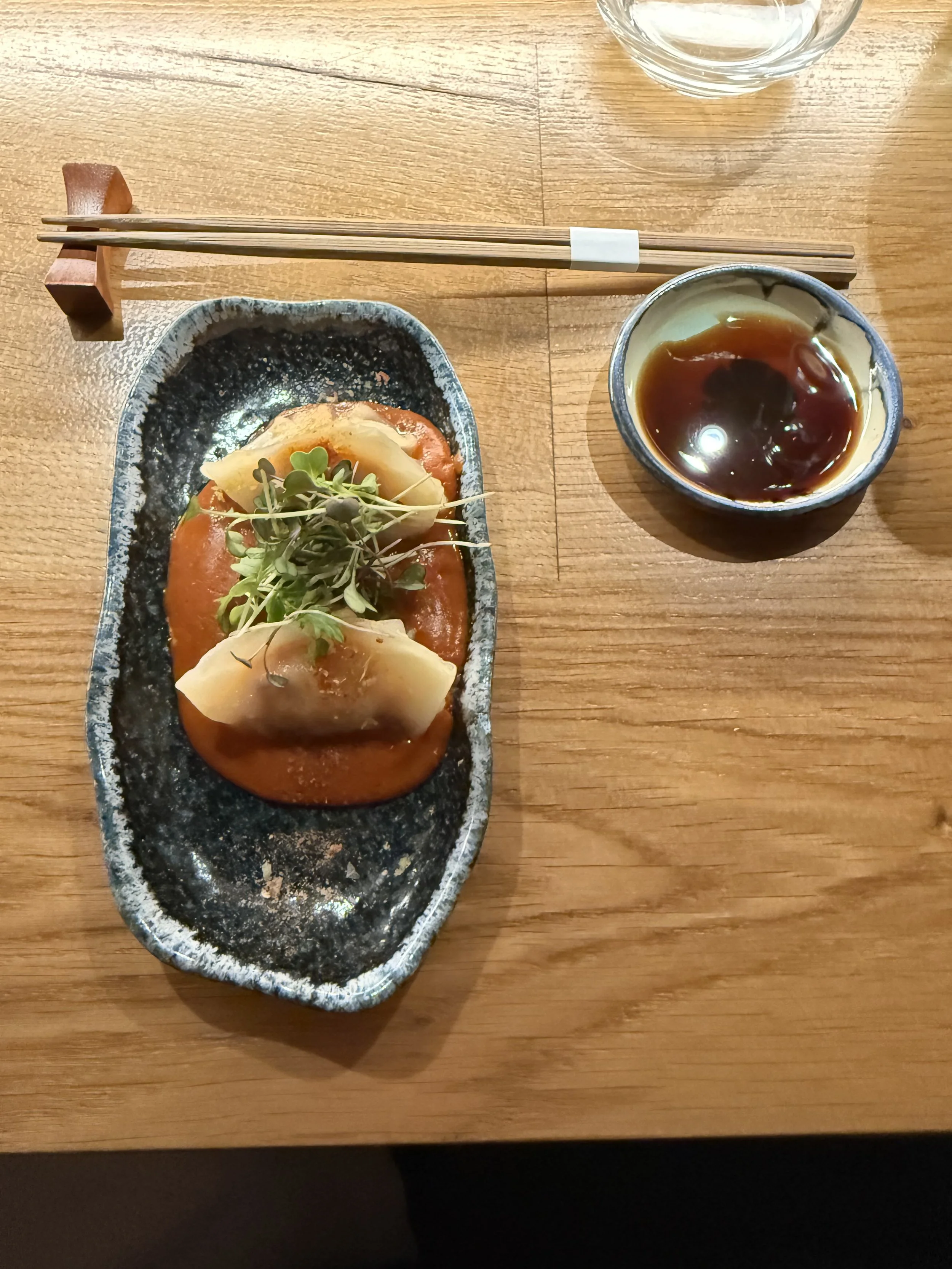 Txangurro is a culinary jewel in Basque gastronomy, a seasonal delicacy that symbolizes the region's intimate relationship with the Cantabrian Sea. Traditionally prepared as txangurro a la donostiarra, baked in the shell with sautéed vegetables, brandy, and breadcrumbs…it's a dish reserved for celebrations and special occasions. To encounter it here, reimagined as a gyoza filling, was to witness culinary fusion at its most thoughtful.